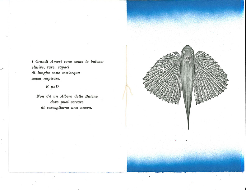 This book was made in Alberto Casiraghi's shop in Osnago. Translation: Like Whales, Great Loves are like whales - elusive, rare, and able to spend long periods underwater without breathing. And after? There is no tree of whales where you can go and pluck another...